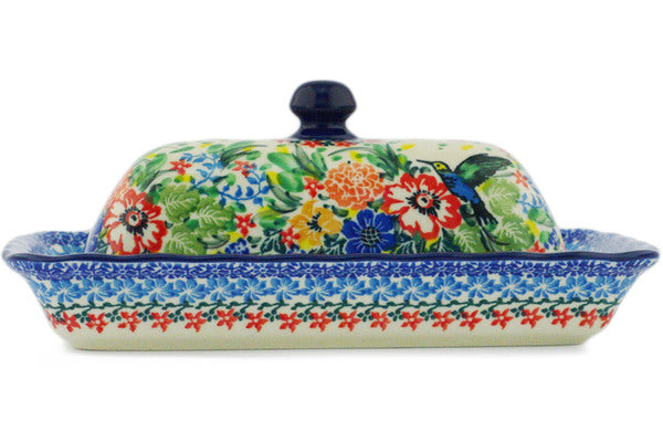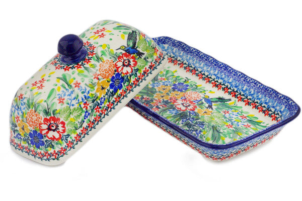 This Hummingbird Meadow 9" Butter Dish was handmade and hand decorated in Boleslawiec, Poland by skilled artisans according to old traditional methods. This is a Polish pottery Signature Unikat, which means that it has been hand painted with both sponges and brushes and it is signed by the artist who painted it. Unikat pieces are the most intricate works of art. Larger Unikat items take hours of very careful work to finish. This Polish stoneware is microwave, dishwasher, freezer, and oven safe up to 480°F. It does not contain lead or cadmium. It is part of the Hummingbird Meadow Collection.