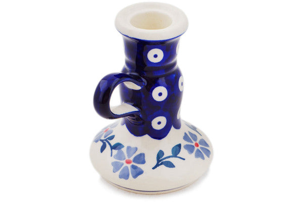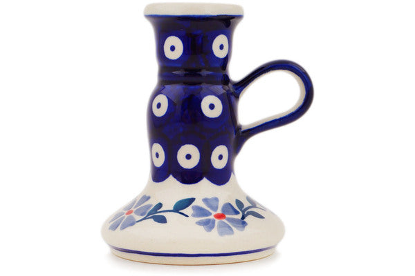 This Peacock Forget-Me-Not 4" Candle Holder was handmade and hand decorated in Boleslawiec, Poland by skilled artisans according to old traditional methods. This Polish stoneware is microwave, dishwasher, freezer, and oven safe up to 480°F. It does not contain lead or cadmium. It is part of the Peacock Forget-Me-Not Collection.