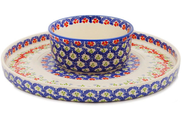 This Red Chains 13" Chip and Dip and Cake Stand Combo was handmade and hand decorated in Boleslawiec, Poland by skilled artisans according to old traditional methods. This is a Polish pottery Signature Unikat, which means that it has been hand painted with both sponges and brushes and it is signed by the artist who painted it. Unikat pieces are the most intricate works of art. Larger Unikat items take hours of very careful work to finish. This Polish stoneware is microwave, dishwasher, freezer, and oven safe up to 480°F. It does not contain lead or cadmium. It is part of the Red Chains Collection.