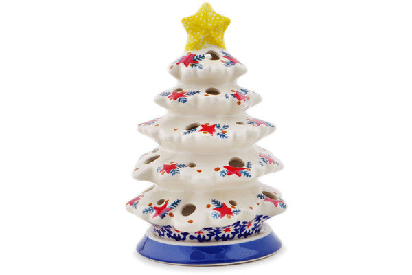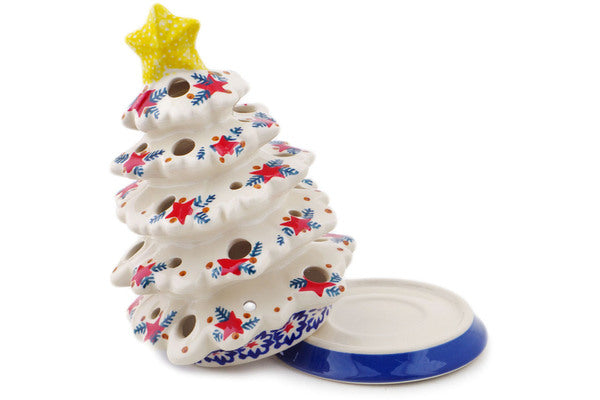 This Starry Wreath 8" Christmas Tree Candle Holder was handmade and hand decorated in Boleslawiec, Poland by skilled artisans according to old traditional methods. This Polish stoneware is microwave, dishwasher, freezer, and oven safe up to 480°F. It does not contain lead or cadmium. It is part of the Starry Wreath Collection.