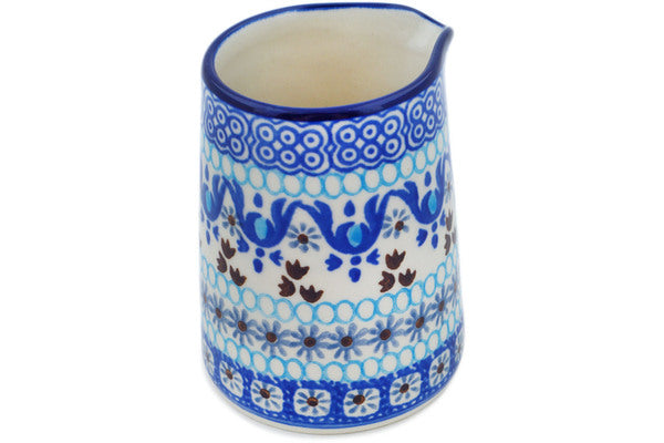 This Blue Ice 7 oz Creamer was handmade and hand decorated in Boleslawiec, Poland by skilled artisans according to old traditional methods. This Polish stoneware is microwave, dishwasher, freezer, and oven safe up to 480°F. It does not contain lead or cadmium. It is part of the Blue Ice Collection.