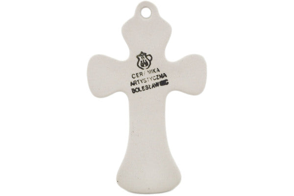 This Blue Daisy Peacock 3" Cross was handmade and hand decorated in Boleslawiec, Poland by skilled artisans according to old traditional methods. This Polish stoneware is microwave, dishwasher, freezer, and oven safe up to 480°F. It does not contain lead or cadmium. It is part of the Blue Daisy Peacock Collection.