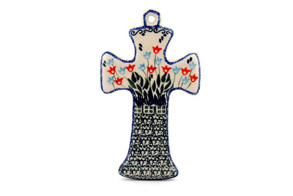 This Dancing Tulips 7" Cross was handmade and hand decorated in Boleslawiec, Poland by skilled artisans according to old traditional methods. This Polish stoneware is microwave, dishwasher, freezer, and oven safe up to 480°F. It does not contain lead or cadmium. It is part of the Dancing Tulips Collection.