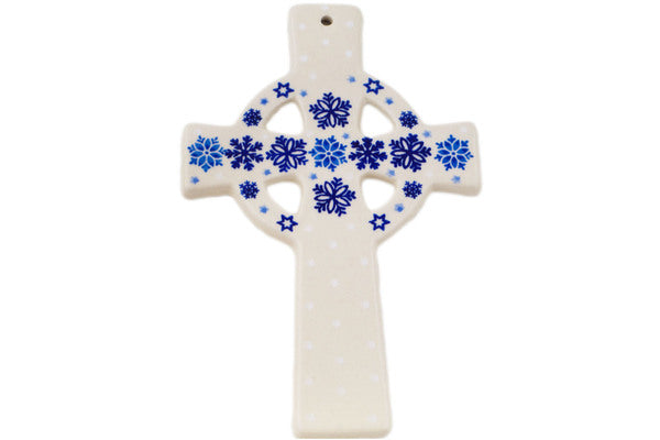 This Snowdrift 9" Cross was handmade and hand decorated in Boleslawiec, Poland by skilled artisans according to old traditional methods. This Polish stoneware is microwave, dishwasher, freezer, and oven safe up to 480°F. It does not contain lead or cadmium. It is part of the Snowdrift Collection.