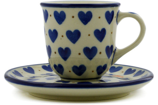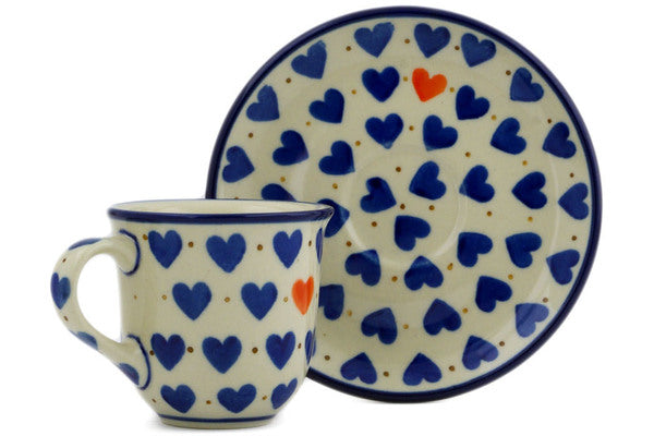 This Heart Of Hearts 3 oz Espresso Cup with Saucer was handmade and hand decorated in Boleslawiec, Poland by skilled artisans according to old traditional methods. This Polish stoneware is microwave, dishwasher, freezer, and oven safe up to 480°F. It does not contain lead or cadmium. It is part of the Heart Of Hearts Collection.