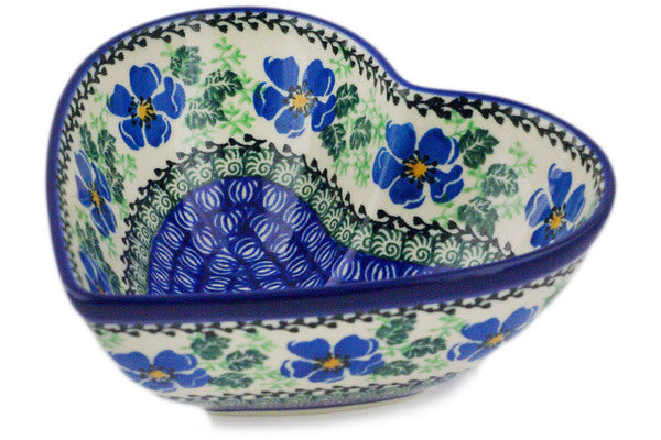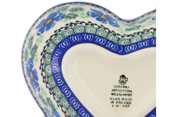 This Scarlet Pimpernel Flower 7" Heart Shaped Bowl was handmade and hand decorated in Boleslawiec, Poland by skilled artisans according to old traditional methods. This Polish stoneware is microwave, dishwasher, freezer, and oven safe up to 480°F. It does not contain lead or cadmium. It is part of the Scarlet Pimpernel Flower Collection.