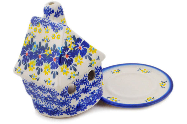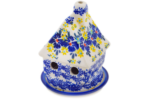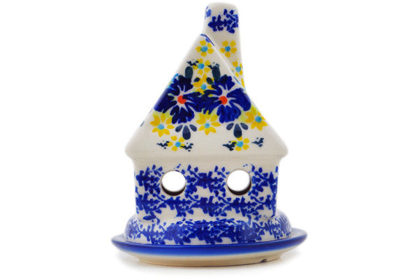 This Cornflower Meadow 5" House Shaped Candle Holder was handmade and hand decorated in Boleslawiec, Poland by skilled artisans according to old traditional methods. This Polish stoneware is microwave, dishwasher, freezer, and oven safe up to 480°F. It does not contain lead or cadmium. It is part of the Cornflower Meadow Collection.