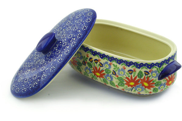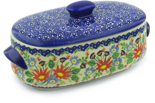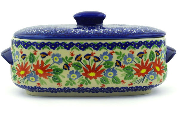 This Folk Flowers 11" Jar with Lid and Handles was handmade and hand decorated in Boleslawiec, Poland by skilled artisans according to old traditional methods. This is a Polish pottery Signature Unikat, which means that it has been hand painted with both sponges and brushes and it is signed by the artist who painted it. Unikat pieces are the most intricate works of art. Larger Unikat items take hours of very careful work to finish. This Polish stoneware is microwave, dishwasher, freezer, and oven safe up to 480°F. It does not contain lead or cadmium. It is part of the Folk Flowers Collection.