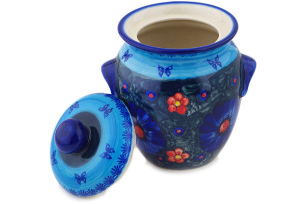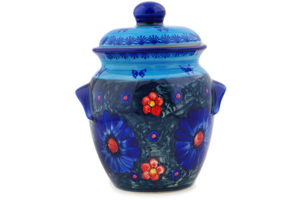 This Midnight Garden 9" Jar with Lid and Handles was handmade and hand decorated in Boleslawiec, Poland by skilled artisans according to old traditional methods. This is a Polish pottery Signature Unikat, which means that it has been hand painted with both sponges and brushes and it is signed by the artist who painted it. Unikat pieces are the most intricate works of art. Larger Unikat items take hours of very careful work to finish. This Polish stoneware is microwave, dishwasher, freezer, and oven safe up to 480°F. It does not contain lead or cadmium. It is part of the Midnight Garden Collection.