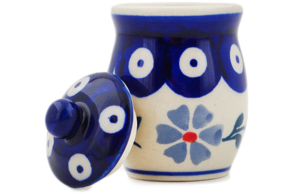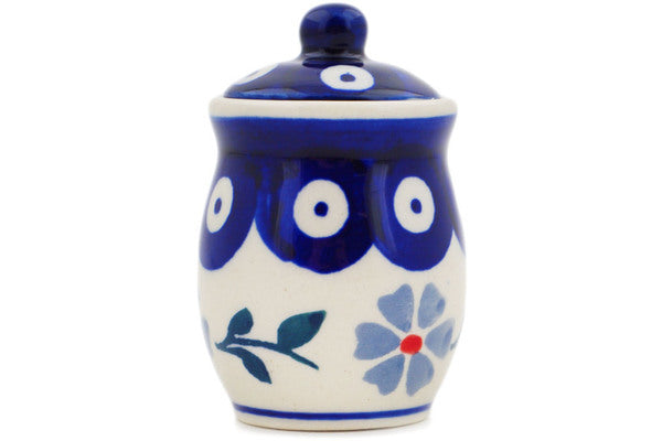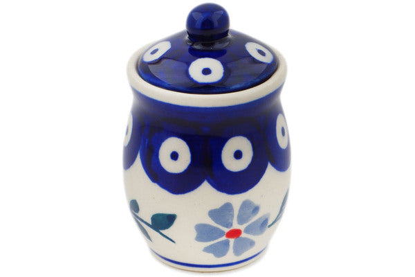 This Peacock Forget-Me-Not 3" Mini Jar was handmade and hand decorated in Boleslawiec, Poland by skilled artisans according to old traditional methods. This Polish stoneware is microwave, dishwasher, freezer, and oven safe up to 480°F. It does not contain lead or cadmium. It is part of the Peacock Forget-Me-Not Collection.