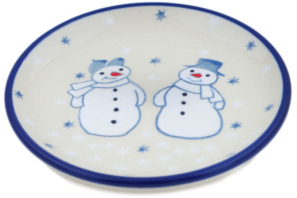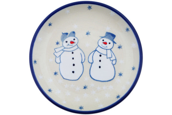 This Snow Couple 4" Mini Plate, Coaster plate was handmade and hand decorated in Boleslawiec, Poland by skilled artisans according to old traditional methods. This Polish stoneware is microwave, dishwasher, freezer, and oven safe up to 480°F. It does not contain lead or cadmium. It is part of the Snow Couple Collection.