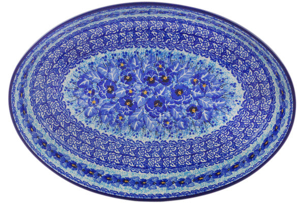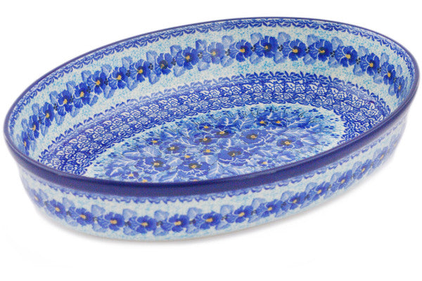 This Deep Winter 12" Oval Baker was handmade and hand decorated in Boleslawiec, Poland by skilled artisans according to old traditional methods. This is a Polish pottery Signature Unikat, which means that it has been hand painted with both sponges and brushes and it is signed by the artist who painted it. Unikat pieces are the most intricate works of art. Larger Unikat items take hours of very careful work to finish. This Polish stoneware is microwave, dishwasher, freezer, and oven safe up to 480°F. It does not contain lead or cadmium. It is part of the Deep Winter Collection.