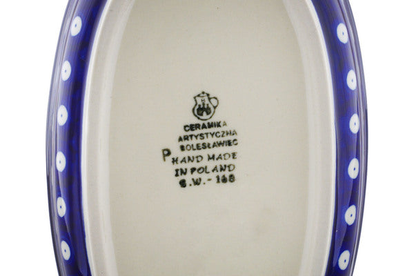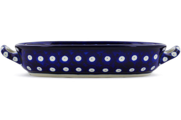 This Bleeding Heart Peacock 8-inch Oval Baker with Handles was handmade and hand decorated in Boleslawiec, Poland by skilled artisans according to old traditional methods. This Polish stoneware is microwave, dishwasher, freezer, and oven safe up to 480°F. It does not contain lead or cadmium. It is part of the Bleeding Heart Peacock Collection.