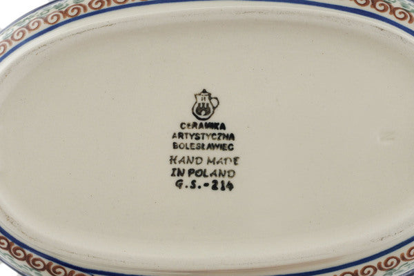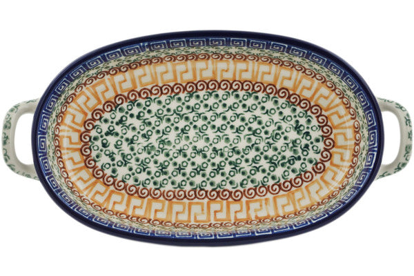 This Grecian Sea 8-inch Oval Baker with Handles was handmade and hand decorated in Boleslawiec, Poland by skilled artisans according to old traditional methods. This Polish stoneware is microwave, dishwasher, freezer, and oven safe up to 480°F. It does not contain lead or cadmium. It is part of the Grecian Sea Collection.
