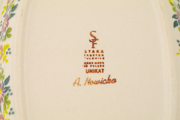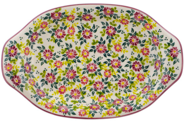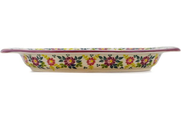 This Marry Me Maroon 13" Oval Dish was handmade and hand decorated in Boleslawiec, Poland by skilled artisans according to old traditional methods. This Polish stoneware is microwave, dishwasher, freezer, and oven safe up to 480°F. It does not contain lead or cadmium. It is part of the Marry Me Maroon Collection.