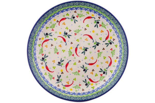 This Pepper Perfection 10" Plate was handmade and hand decorated in Boleslawiec, Poland by skilled artisans according to old traditional methods. This is a Polish pottery Signature Unikat, which means that it has been hand painted with both sponges and brushes and it is signed by the artist who painted it. Unikat pieces are the most intricate works of art. Larger Unikat items take hours of very careful work to finish. This Polish stoneware is microwave, dishwasher, freezer, and oven safe up to 480°F. It does not contain lead or cadmium. It is part of the Pepper Perfection Collection.