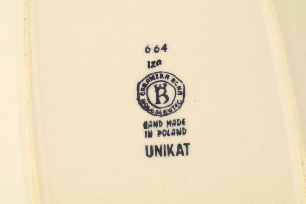 This Gorgeous Morning Glory 14" Platter was handmade and hand decorated in Boleslawiec, Poland by skilled artisans according to old traditional methods. This is a Polish pottery Signature Unikat, which means that it has been hand painted with both sponges and brushes and it is signed by the artist who painted it. Unikat pieces are the most intricate works of art. Larger Unikat items take hours of very careful work to finish. This Polish stoneware is microwave, dishwasher, freezer, and oven safe up to 480°F. It does not contain lead or cadmium. It is part of the Gorgeous Morning Glory Collection.