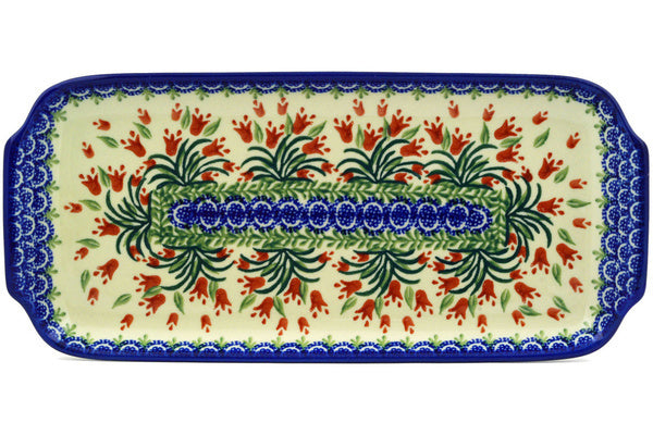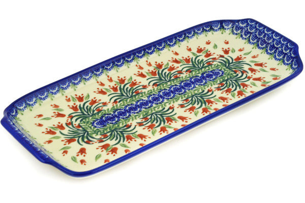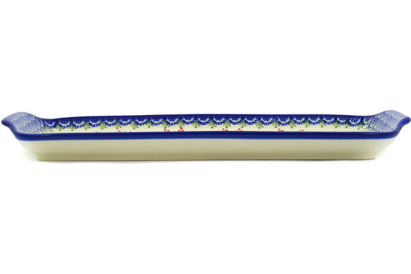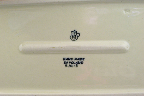 This Maroon Bells 13" Platter with Handles was handmade and hand decorated in Boleslawiec, Poland by skilled artisans according to old traditional methods. This Polish stoneware is microwave, dishwasher, freezer, and oven safe up to 480°F. It does not contain lead or cadmium. It is part of the Maroon Bells Collection.