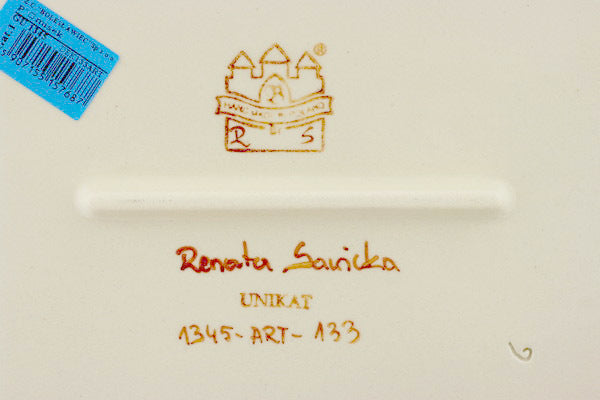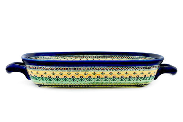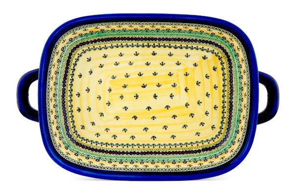 This Prairie Sunrise 18" Rectangular Baker with Handles was handmade and hand decorated in Boleslawiec, Poland by skilled artisans according to old traditional methods. This is a Polish pottery Signature Unikat, which means that it has been hand painted with both sponges and brushes and it is signed by the artist who painted it. Unikat pieces are the most intricate works of art. Larger Unikat items take hours of very careful work to finish. This Polish stoneware is microwave, dishwasher, freezer, and oven safe up to 480°F. It does not contain lead or cadmium. It is part of the Prairie Sunrise Collection.