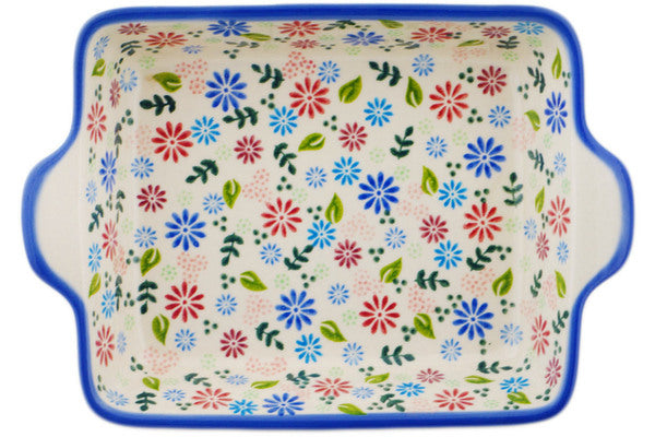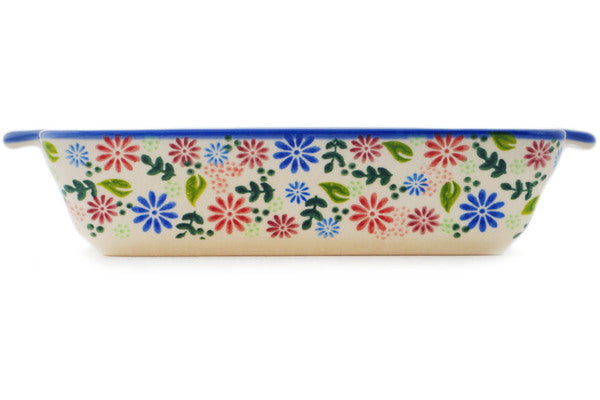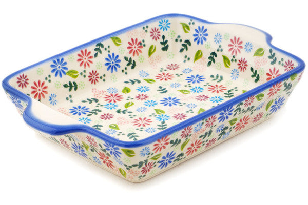 This Gerbera Garden 9" Rectangular Baker with Handles was handmade and hand decorated in Boleslawiec, Poland by skilled artisans according to old traditional methods. This Polish stoneware is microwave, dishwasher, freezer, and oven safe up to 480°F. It does not contain lead or cadmium. It is part of the Gerbera Garden Collection.