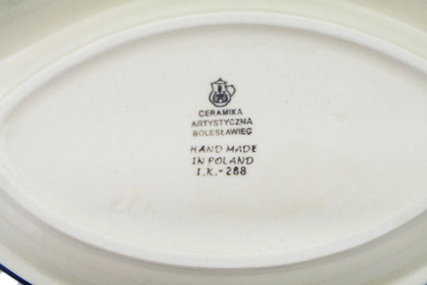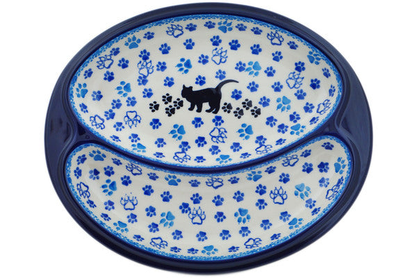This Boo Boo Kitty Paws 10" sausage plate was handmade and hand decorated in Boleslawiec, Poland by skilled artisans according to old traditional methods. This Polish stoneware is microwave, dishwasher, freezer, and oven safe up to 480°F. It does not contain lead or cadmium. It is part of the Boo Boo Kitty Paws Collection.