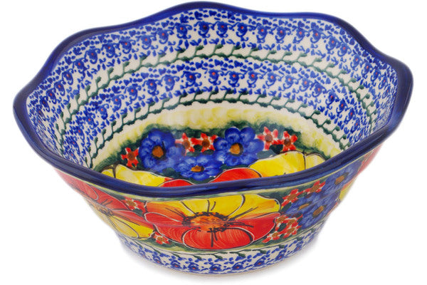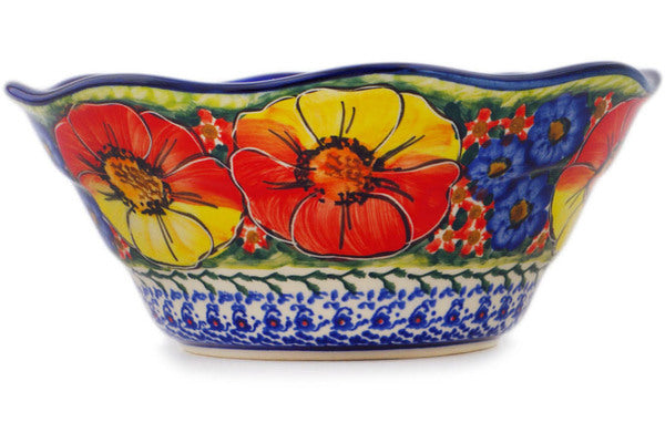 This Mystical Garden 7" Scalloped Bowl was handmade and hand decorated in Boleslawiec, Poland by skilled artisans according to old traditional methods. This is a Polish pottery Signature Unikat, which means that it has been hand painted with both sponges and brushes and it is signed by the artist who painted it. Unikat pieces are the most intricate works of art. Larger Unikat items take hours of very careful work to finish. This Polish stoneware is microwave, dishwasher, freezer, and oven safe up to 480°F. It does not contain lead or cadmium. It is part of the Mystical Garden Collection.