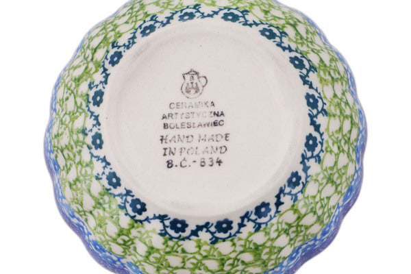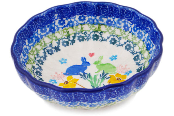 This Hopping In Love 5" Scalloped Fluted Bowl was handmade and hand decorated in Boleslawiec, Poland by skilled artisans according to old traditional methods. This Polish stoneware is microwave, dishwasher, freezer, and oven safe up to 480°F. It does not contain lead or cadmium. It is part of the Hopping In Love Collection.