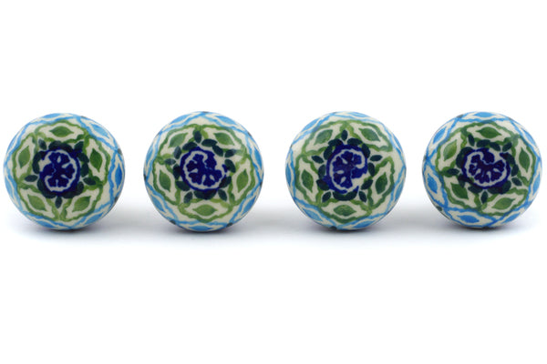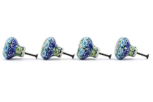 This Aztec Eyes Set of 4 Drawer Pull Knobs 1-1/2 inch was handmade and hand decorated in Boleslawiec, Poland by skilled artisans according to old traditional methods. This Polish stoneware is microwave, dishwasher, freezer, and oven safe up to 480°F. It does not contain lead or cadmium. It is part of the Aztec Eyes Collection.