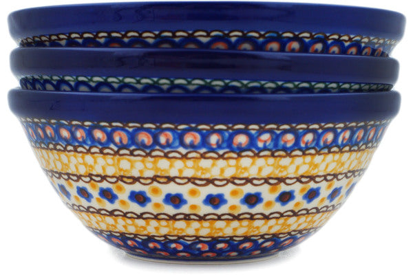This Mix Set of Three 5-inch bowls was handmade and hand decorated in Boleslawiec, Poland by skilled artisans according to old traditional methods. This Polish stoneware is microwave, dishwasher, freezer, and oven safe up to 480°F. It does not contain lead or cadmium. It is part of the Mix Collection.