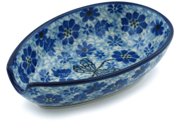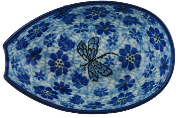 This Misty Dragonfly 5" Spoon Rest was handmade and hand decorated in Boleslawiec, Poland by skilled artisans according to old traditional methods. This Polish stoneware is microwave, dishwasher, freezer, and oven safe up to 480°F. It does not contain lead or cadmium. It is part of the Misty Dragonfly Collection.
