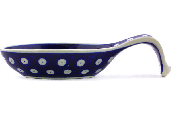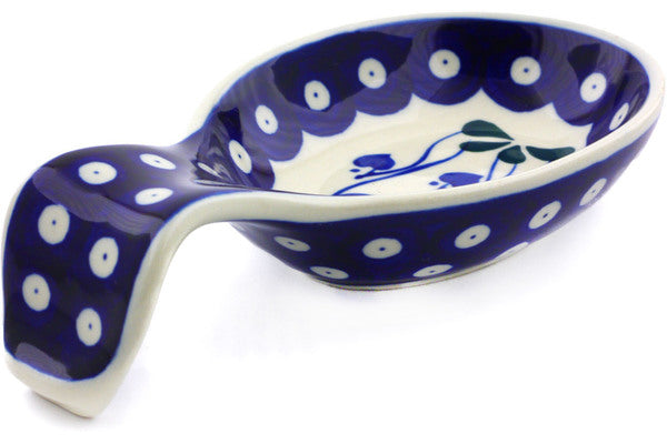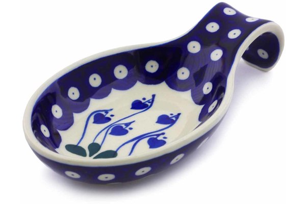 This Bleeding Heart Peacock 7" Spoon Rest was handmade and hand decorated in Boleslawiec, Poland by skilled artisans according to old traditional methods. This Polish stoneware is microwave, dishwasher, freezer, and oven safe up to 480°F. It does not contain lead or cadmium. It is part of the Bleeding Heart Peacock Collection.