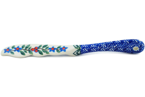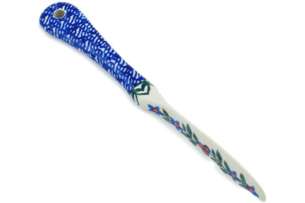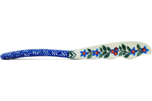 This Azure Blooms 7" Spreading Knife was handmade and hand decorated in Boleslawiec, Poland by skilled artisans according to old traditional methods. This Polish stoneware is microwave, dishwasher, freezer, and oven safe up to 480°F. It does not contain lead or cadmium. It is part of the Azure Blooms Collection.