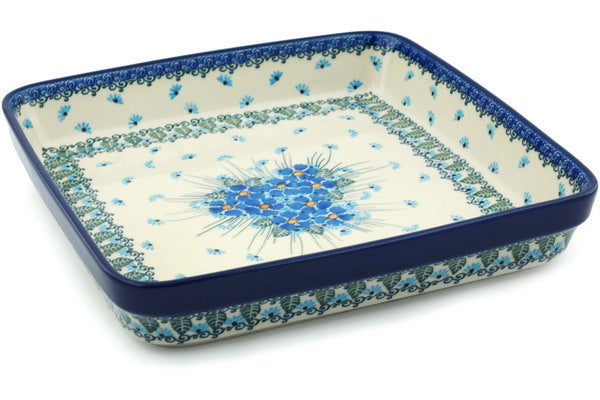This Forget Me Not 10" Square Baker was handmade and hand decorated in Boleslawiec, Poland by skilled artisans according to old traditional methods. This is a Polish pottery Signature Unikat, which means that it has been hand painted with both sponges and brushes and it is signed by the artist who painted it. Unikat pieces are the most intricate works of art. Larger Unikat items take hours of very careful work to finish. This Polish stoneware is microwave, dishwasher, freezer, and oven safe up to 480°F. It does not contain lead or cadmium. It is part of the Forget Me Not Collection.