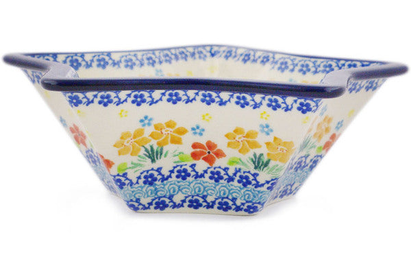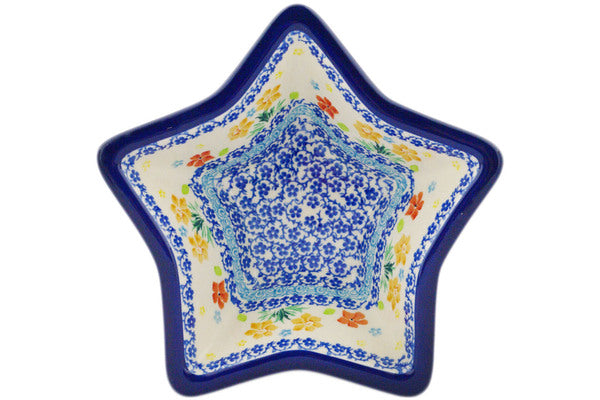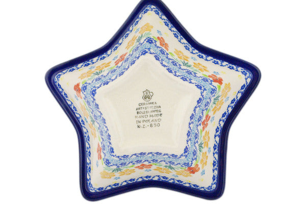 This Creamy Saffron 8" Star Shaped Bowl was handmade and hand decorated in Boleslawiec, Poland by skilled artisans according to old traditional methods. This Polish stoneware is microwave, dishwasher, freezer, and oven safe up to 480°F. It does not contain lead or cadmium. It is part of the Creamy Saffron Collection.