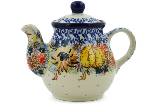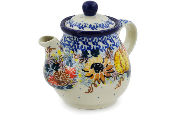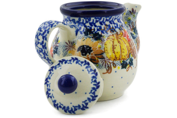 This Autumn Falling Leaves 13 oz Tea or Coffee Pot was handmade and hand decorated in Boleslawiec, Poland by skilled artisans according to old traditional methods. This is a Polish pottery Signature Unikat, which means that it has been hand painted with both sponges and brushes and it is signed by the artist who painted it. Unikat pieces are the most intricate works of art. Larger Unikat items take hours of very careful work to finish. This Polish stoneware is microwave, dishwasher, freezer, and oven safe up to 480°F. It does not contain lead or cadmium. It is part of the Autumn Falling Leaves Collection.