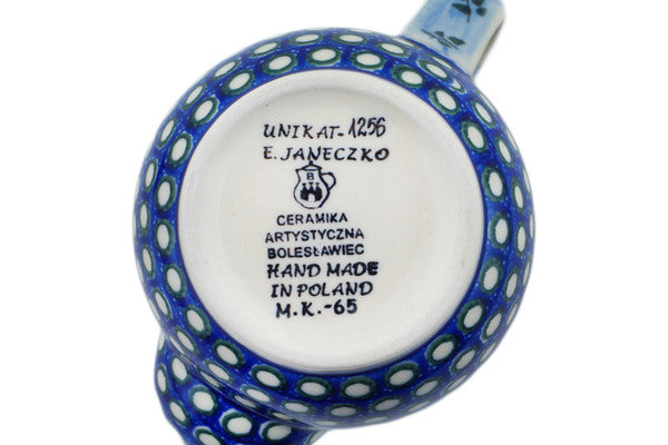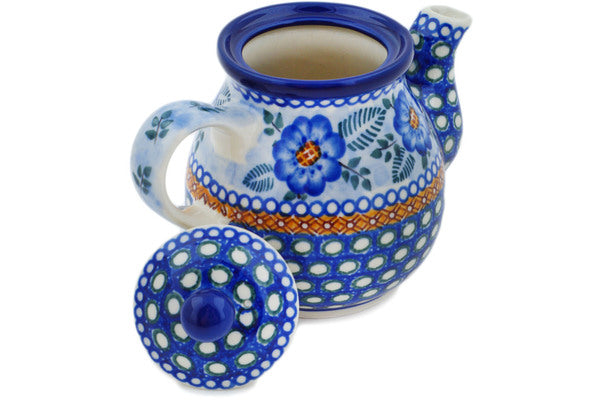 This Blue Poppy Circle 13 oz Tea or Coffee Pot was handmade and hand decorated in Boleslawiec, Poland by skilled artisans according to old traditional methods. This is a Polish pottery Signature Unikat, which means that it has been hand painted with both sponges and brushes and it is signed by the artist who painted it. Unikat pieces are the most intricate works of art. Larger Unikat items take hours of very careful work to finish. This Polish stoneware is microwave, dishwasher, freezer, and oven safe up to 480°F. It does not contain lead or cadmium. It is part of the Blue Poppy Circle Collection.