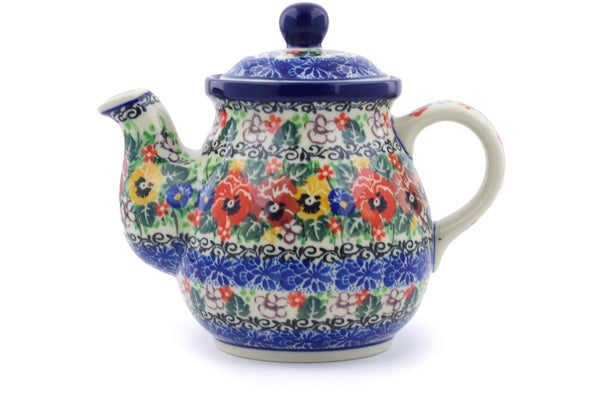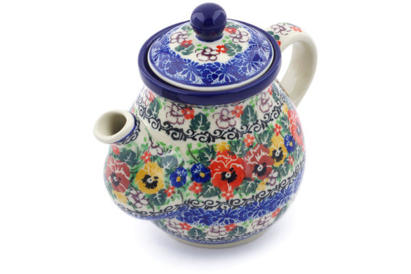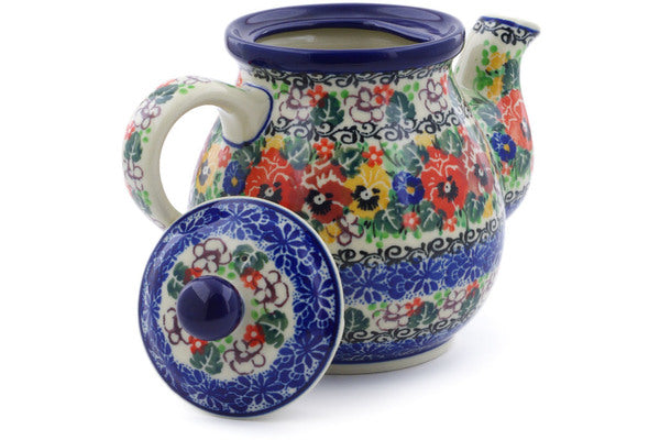 This Pansy Garden 20 oz Tea or Coffee Pot was handmade and hand decorated in Boleslawiec, Poland by skilled artisans according to old traditional methods. This is a Polish pottery Signature Unikat, which means that it has been hand painted with both sponges and brushes and it is signed by the artist who painted it. Unikat pieces are the most intricate works of art. Larger Unikat items take hours of very careful work to finish. This Polish stoneware is microwave, dishwasher, freezer, and oven safe up to 480°F. It does not contain lead or cadmium. It is part of the Pansy Garden Collection.