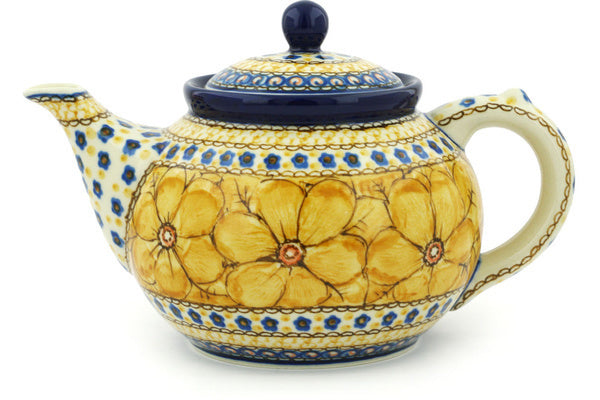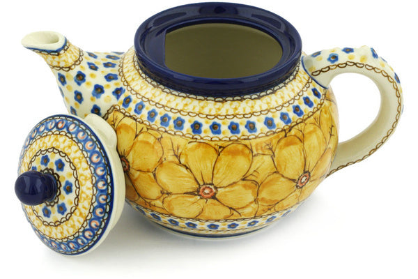 This Marigold Dreams 5 cups Tea or Coffee Pot was handmade and hand decorated in Boleslawiec, Poland by skilled artisans according to old traditional methods. This is a Polish pottery Signature Unikat, which means that it has been hand painted with both sponges and brushes and it is signed by the artist who painted it. Unikat pieces are the most intricate works of art. Larger Unikat items take hours of very careful work to finish. This Polish stoneware is microwave, dishwasher, freezer, and oven safe up to 480°F. It does not contain lead or cadmium. It is part of the Marigold Dreams Collection.