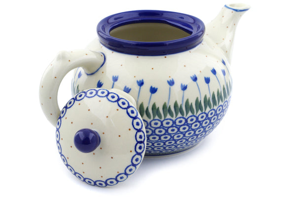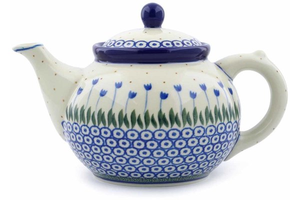 This Water Tulip 5 cups Tea or Coffee Pot was handmade and hand decorated in Boleslawiec, Poland by skilled artisans according to old traditional methods. This Polish stoneware is microwave, dishwasher, freezer, and oven safe up to 480°F. It does not contain lead or cadmium. It is part of the Water Tulip Collection.