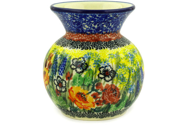 This Copper Rose Meadow 4" Vase was handmade and hand decorated in Boleslawiec, Poland by skilled artisans according to old traditional methods. This is a Polish pottery Signature Unikat, which means that it has been hand painted with both sponges and brushes and it is signed by the artist who painted it. Unikat pieces are the most intricate works of art. Larger Unikat items take hours of very careful work to finish. This Polish stoneware is microwave, dishwasher, freezer, and oven safe up to 480°F. It does not contain lead or cadmium. It is part of the Copper Rose Meadow Collection.